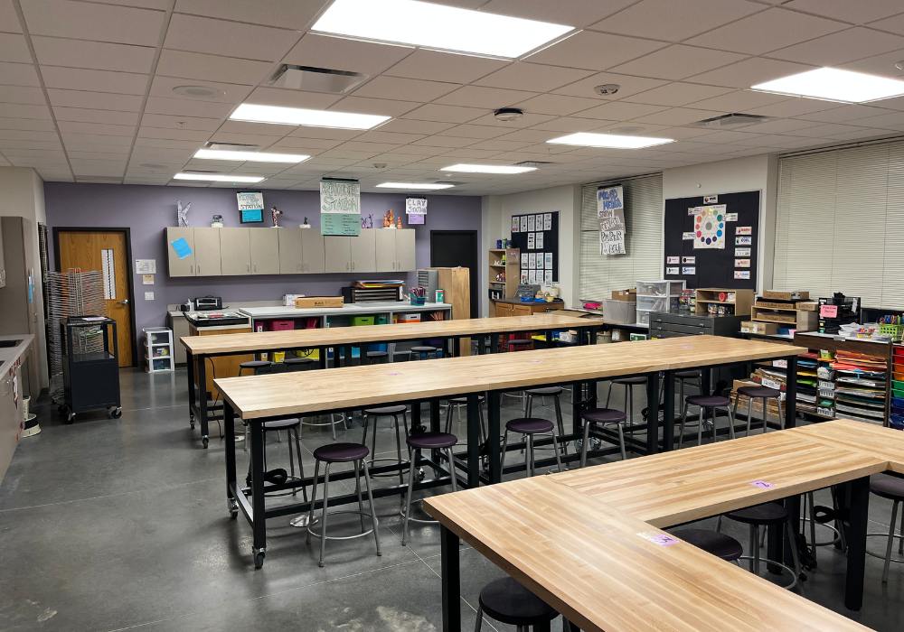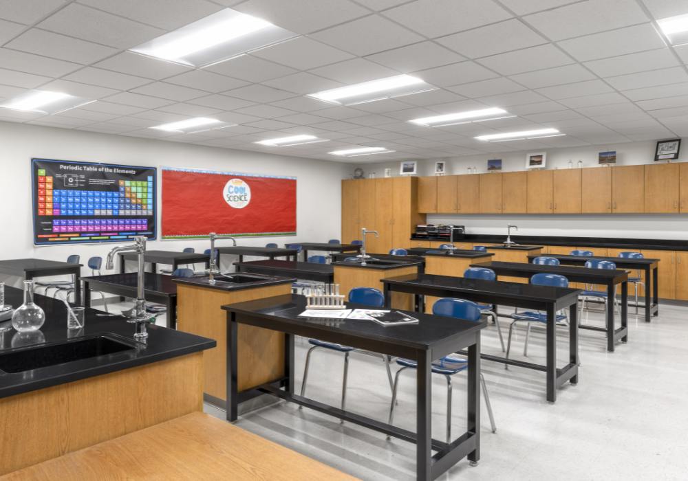 Mascoutah Middle School: Improvements included a new cafeteria, kitchen, and multipurpose auditorium seating over 400 students, supported by a full-service kitchen with secure storage, walk-in cooler and freezer, and staff areas. Addition of a library, media lab, science and art classrooms, esports rooms, general and special education spaces, and an outdoor classroom. Renovations converted the former library into student services offices, upgraded science classrooms, added new flooring, and delivered an athletic support building with storage, restrooms, utilities, and concessions.